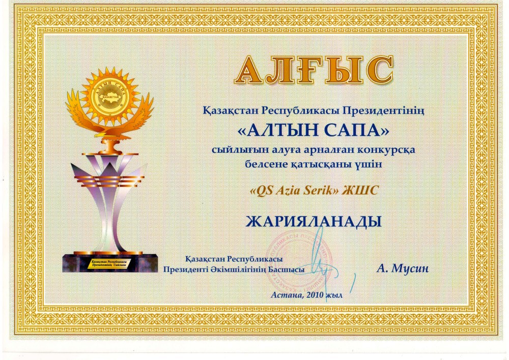 ТОО «QS Azia Sertik» зарегистрировано в качестве юридического лица Республики Казахстан и действует в соответствии с Уставом. Орган по подтверждению соответствия ТОО «QS Azia Sertik» (далее по тексту ОПС ТОО «QS Azia Sertik») является молодой, растущей и динамично развивающейся организацией, оказывающей услуги в области сертификации систем менеджмента, продукции и экспертизы происхождения товара. Аттестат аккредитации по системе менеджмента - KZ. О.00.0305, аттестат аккредитации по продукции - KZ. О.02.0802.